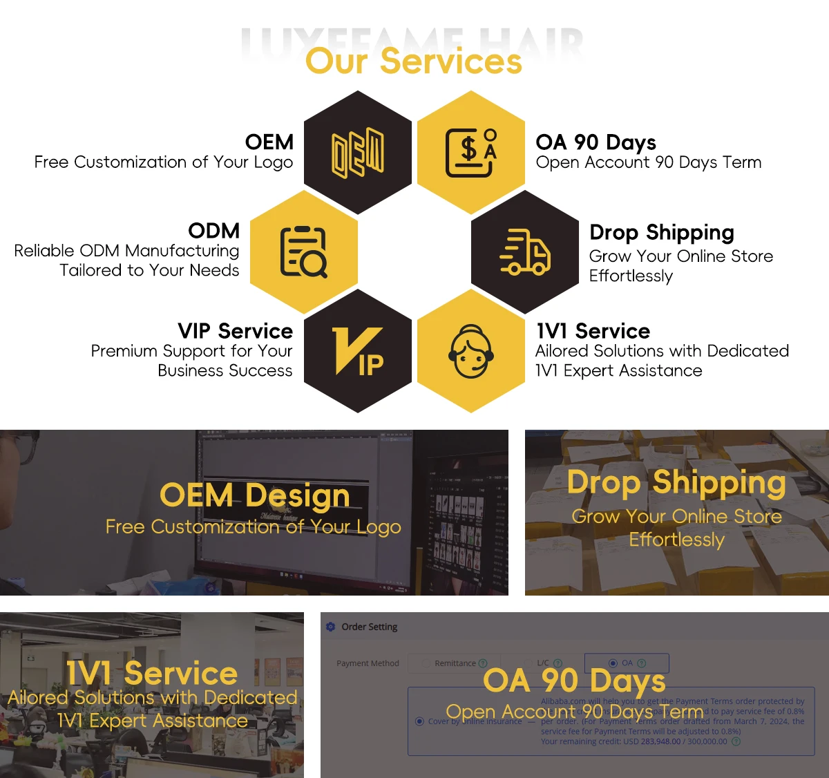 Guangzhou Luxefame Hair is a professional team of 100% real human hair. Our factory has more than10 years professional experience on human hair production, and the hot-selling products include: Brazilian hair, Peruvian hair, Malaysian hair, Indian hair, hair wigs, lace closure, ombre hair and etc. We have numerous customers visiting our company and warehouse, and get high evaluation on our caring service and excellent quality. In addition to human hair, we also provide OEM customized service, high-definition product photo, package design drawing to meet customers’demands in a timely manner. We have a strict and complete quality control system. All products are strictly inspected before shipment. We are bound to make every effort to achieve this win-win situation, welcome to join us.